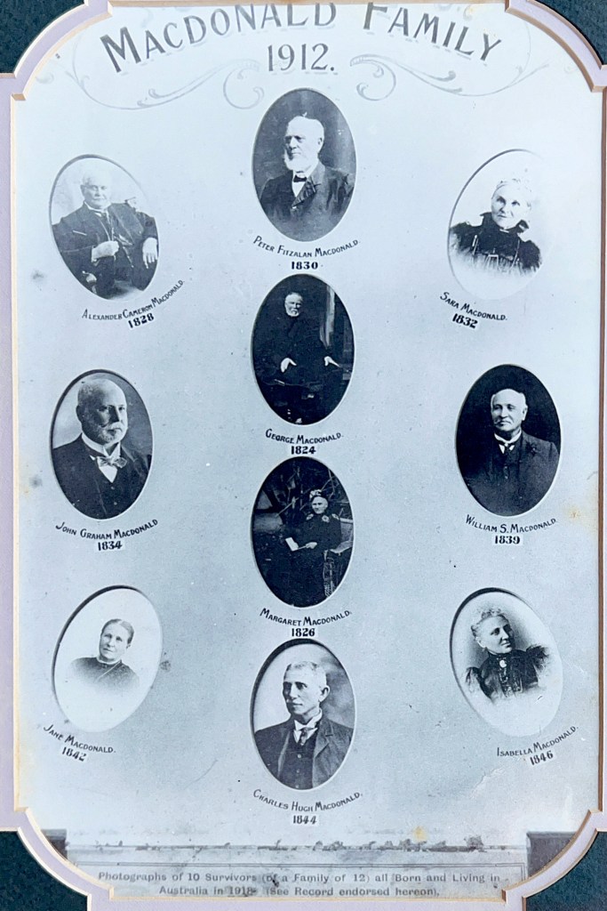 Alexander’s sons received the education he had been denied and some achieved renown. Alexander Cameron Macdonald (1828-1917), accountant, surveyor and geographer and Peter Fitzallan Macdonald (1830-1919), pastoralist, entrepreneur and politician, appear in the Australian Dictionary of Biography. John Graham Macdonald (1834–1918), explorer, pastoralist and police magistrate published a journal, ‘Expedition from Port Denison to the Gulf of Carpentaria and back.’ His remaining children became farmers or farmers wives and raised large families.